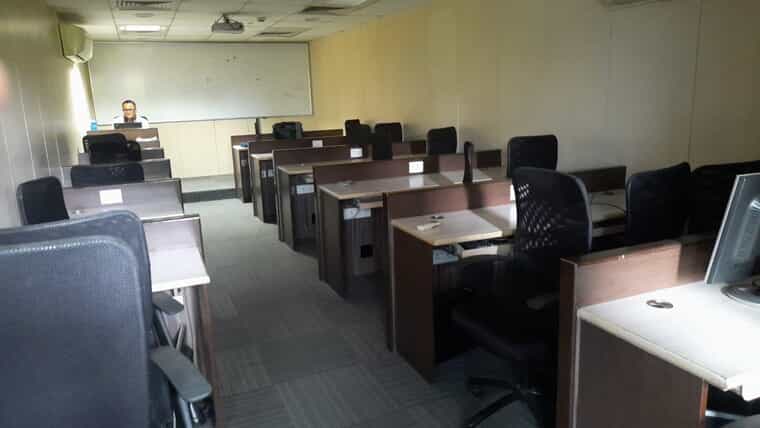 The room follows a simple classroom layout. Therefore, trainers maintain clear visibility at all times. In addition, the space includes essential IT and AV facilities. As a result, sessions run smoothly without technical breaks. This setup works well for onboarding, technical training, and certification programs.