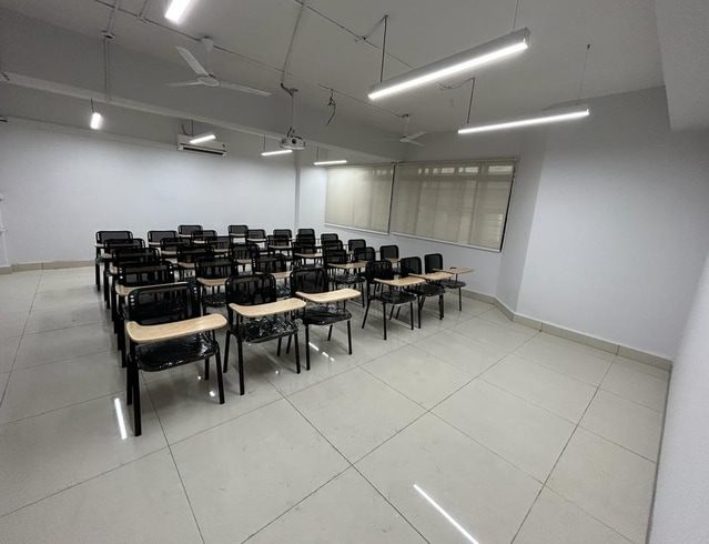 The room uses a flap chair seating layout with writing ledges. As a result, participants can take notes comfortably during sessions. This setup suits lecture-driven and discussion-based formats. It works especially well for banking, finance, compliance, academic coaching, and soft-skills training. Moreover, the layout keeps attention focused on the trainer throughout the session.