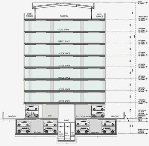 This office building in OMR Chennai is built for uninterrupted operations. It offers 100% power backup, high-speed elevators, and well-planned vertical circulation across floors. Additionally, basement and stilt parking provide structured access for employees and visitors.