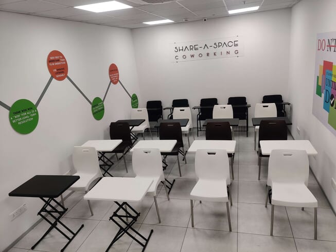 This training space offers a clean classroom-style layout designed for focused learning. It suits corporate workshops, onboarding sessions, and internal training programs. Clear visibility, comfortable seating, and a distraction-free setup make it a practical choice for SMEs and corporate teams.